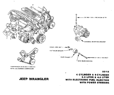 This kit is for YJ's with an OE Compressor Bracket. The kit fits 1991-1995 YJ's with 2.5 and 4.0 Liter Engine. The kit includes the drive belt, idler pulley, idler bushing, idler spacer, bolts and washers. The belt kit is for a serpentine compressor.